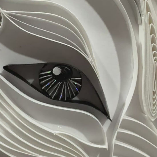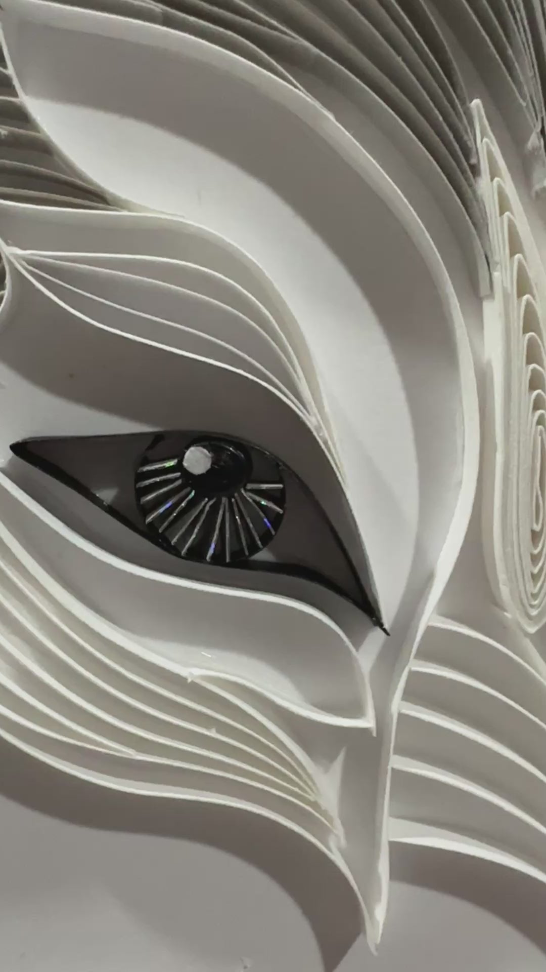 Introducing "Ghost of the Woods," an enchanting piece that captures the mystical essence of the wilderness through the art of quilling paper. This artwork presents a striking portrayal of a wolf's head, utilizing an impressive array of paper strips in monochromatic hues—black, white, and gray. The meticulous craftsmanship is evident in the intricate rolling and shaping of each paper strip, which collectively form the wolf’s intricate features with stunning depth and realism.