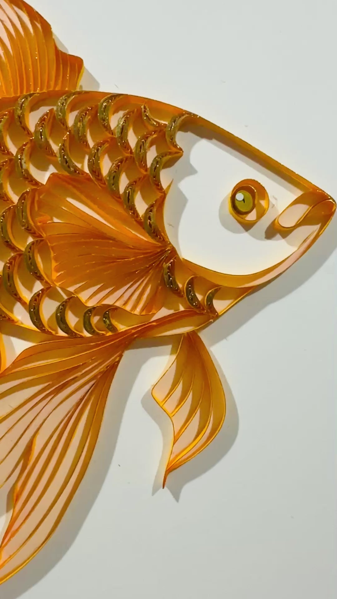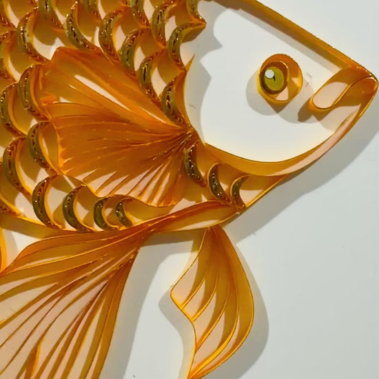 The artwork employs the quilling technique to add a remarkable dimension and texture, with each quilled strip carefully shaped and placed to enhance the fish's intricate patterns. The use of golden edge paper as the material adds a luxurious touch, highlighting the luminous quality of the artwork. The background enhances this sense of whimsy and lightness, with a subtle gradient interspersed with sparkling dots. These shimmering elements reflect the delicate interplay of light across water, imbuing the piece with an ethereal quality. The overall composition invites the viewer to immerse themselves in the tranquil yet lively underwater domain, where the goldfish dances freely.