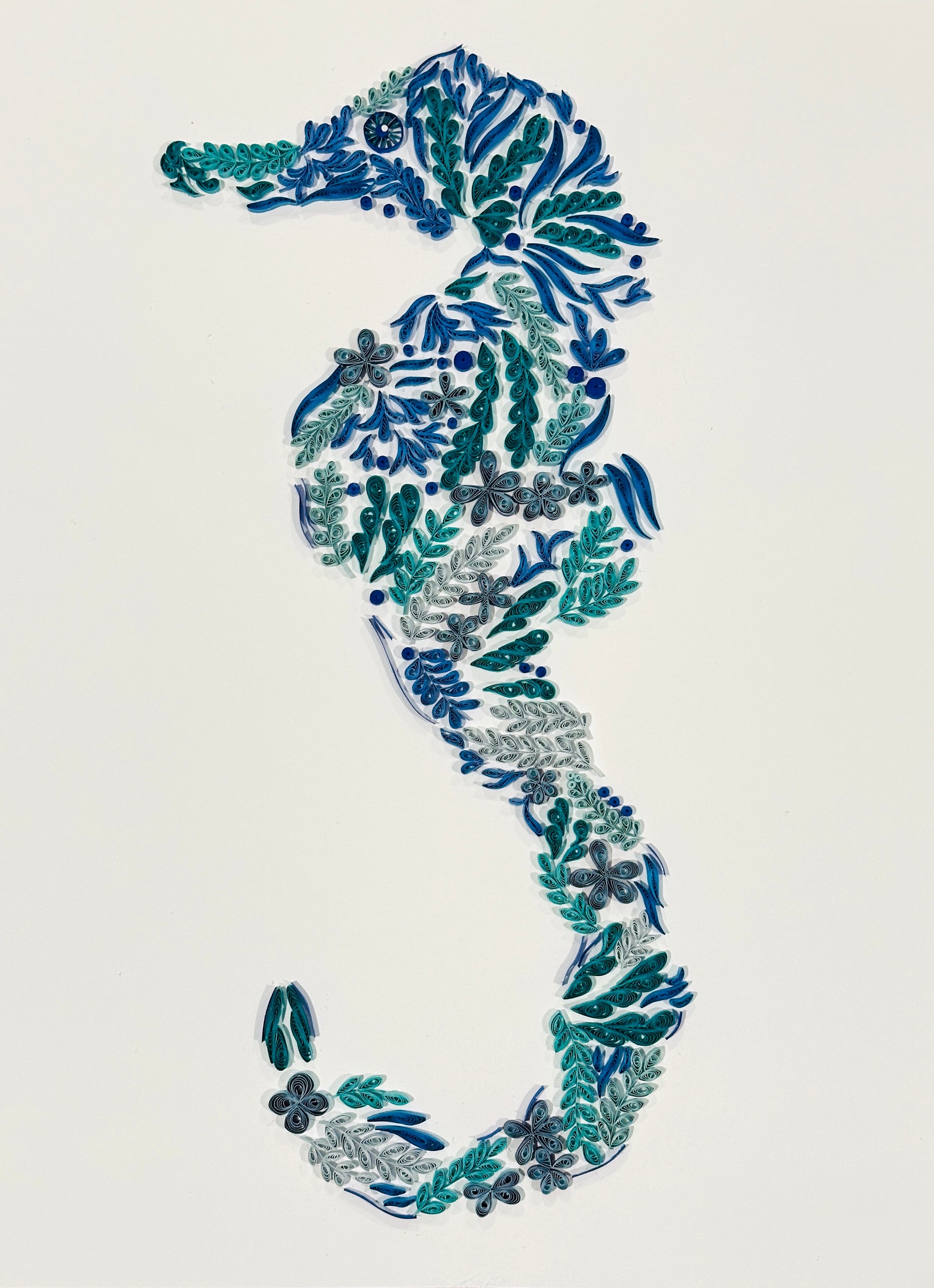 Inspired by the deep-sea wonders and the intricate forms of marine life, "Ocean's Jewel" invites viewers to explore the enchanting beauty of one of nature's most fascinating creatures. This artwork is a celebration of the delicate balance and vibrant life found beneath the waves, crafted with a keen eye for detail that highlights the seahorse's graceful presence. Through the vivid interplay of color, texture, and the quilling technique, "Ocean's Jewel" offers a glimpse into the artist's vision of the sea's treasures, encouraging a lasting connection with the tranquility and vibrancy of the oceanic world.