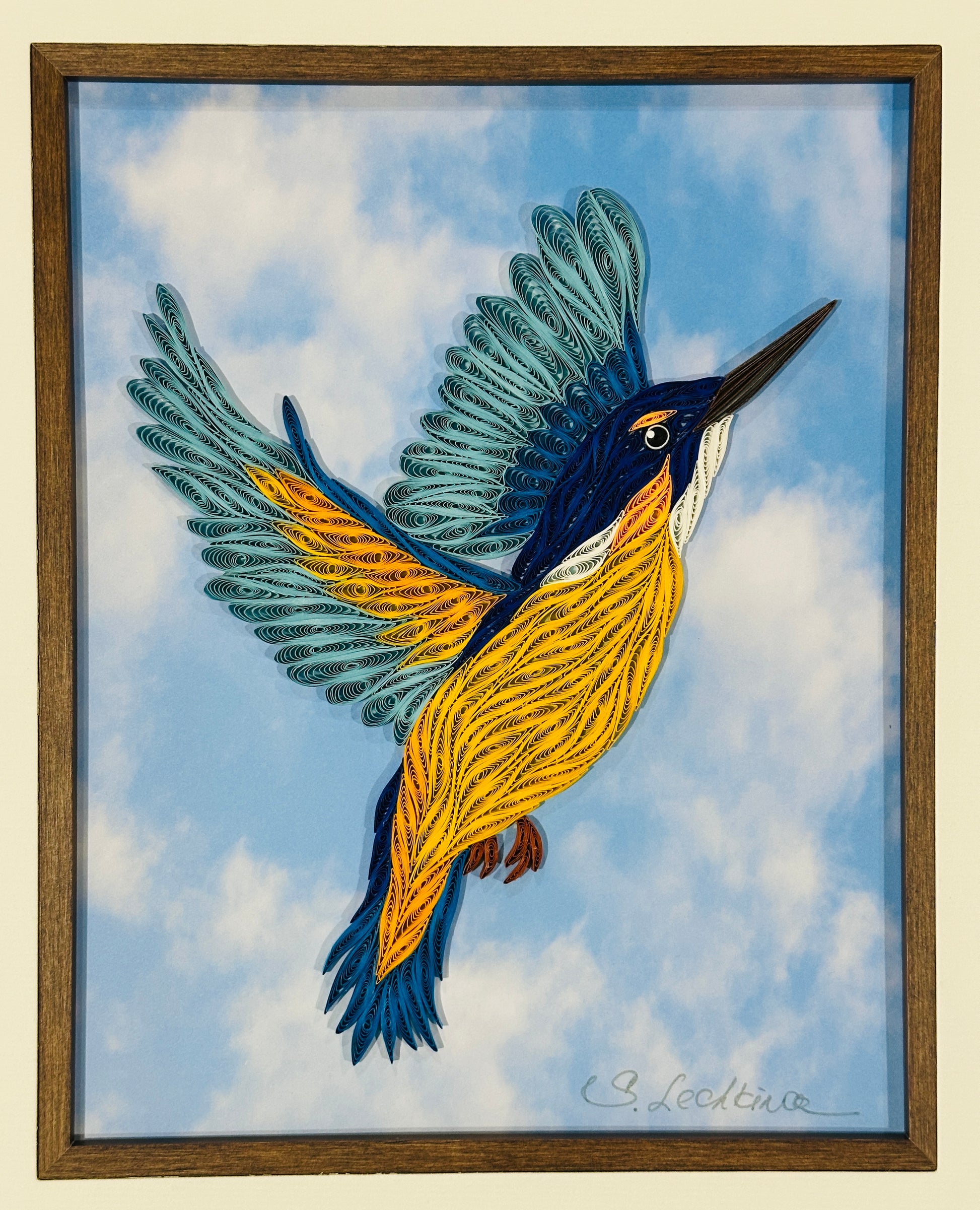 This beautiful kingfisher made entirely out of paper strips by quilling artist Lana Lechkina is a truly stunning piece of framed art.