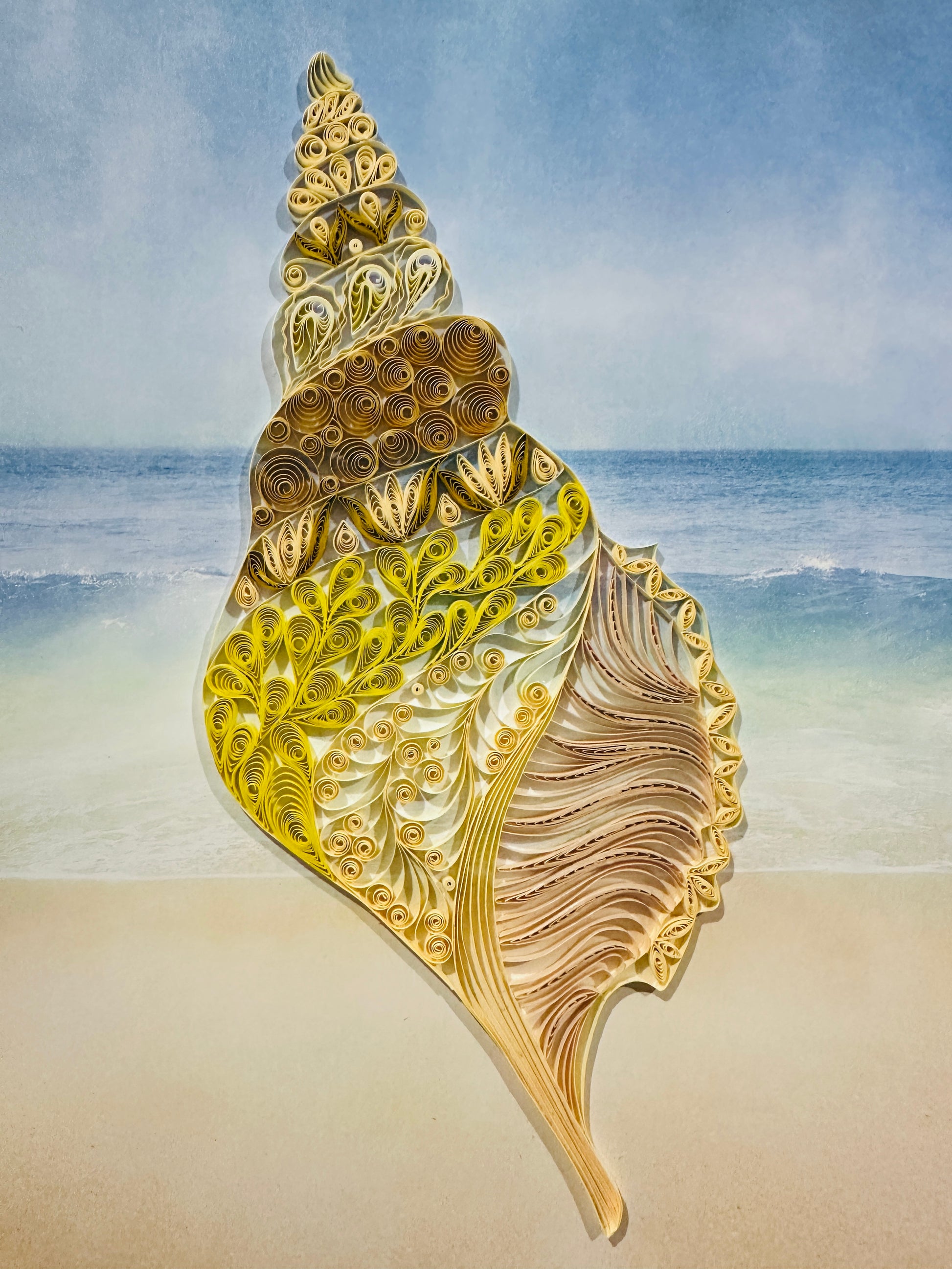 "Whispers of the Deep" invites you into an immersive underwater journey, captured through the intricate art of quilling. This 11x14" masterpiece portrays a seashell, meticulously crafted with coiled paper in rich hues of gold, yellow, and royal blue. The colors, brilliantly intertwined, breathe life into a design that reflects the true essence of oceanic wonder—a perfect marriage of bold vibrancy and detailed simplicity.
